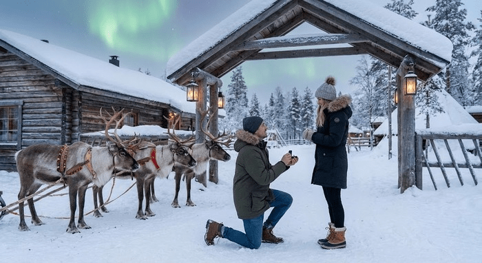 Cuando sea el momento adecuado, toma la mano de tu pareja y haz la gran pregunta. La combinación del paisaje ártico, la quietud del bosque y la presencia tranquila de los renos creará una escena tan romántica como inolvidable.