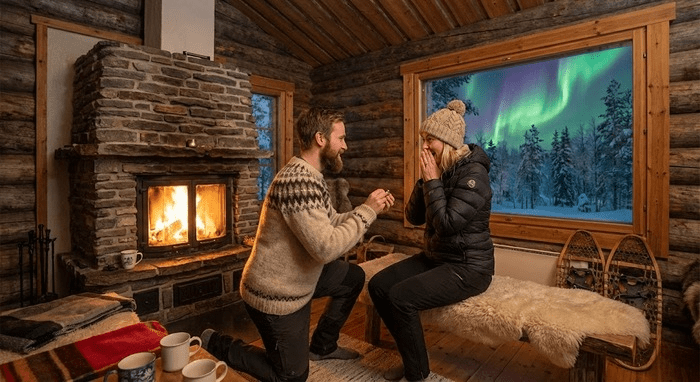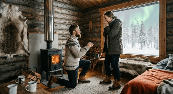 Cuando llegue el momento ideal, podrás hacer la gran pregunta. La intimidad del lugar, combinada con la magia del Ártico, convierten este gesto en una vivencia profundamente emotiva y difícil de olvidar.