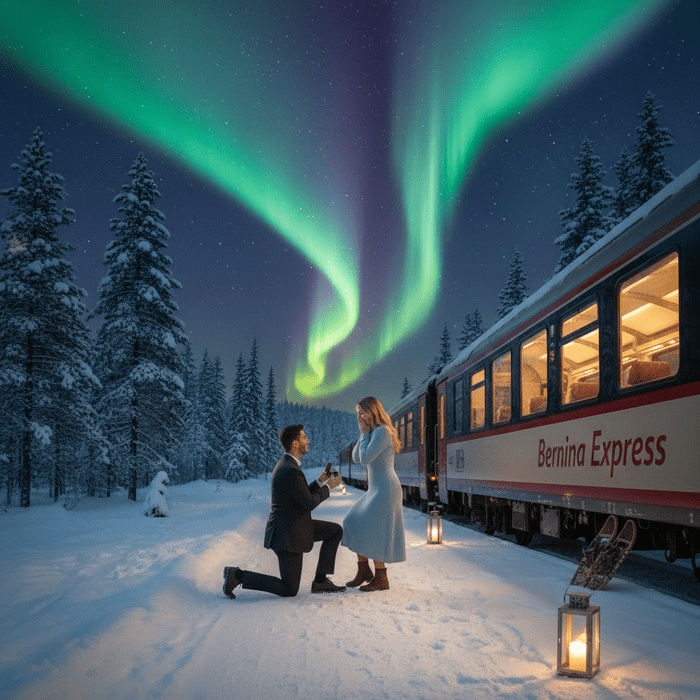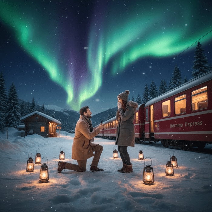 This proposal on the Bernina Express at the end of the journey is ideal for those seeking romance, surprise, and a spectacular finale, transforming a scenic train trip into the perfect setting to begin your life together.