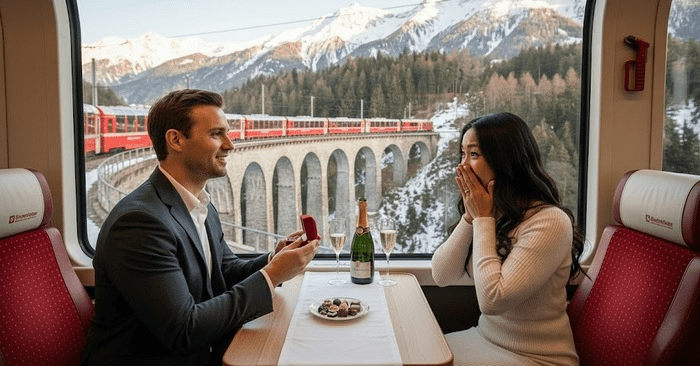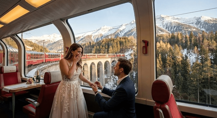 Turn a trip through the Alps into an unforgettable memory with a marriage proposal on the Bernina Express at the Panoramic Curve, one of the most spectacular panoramic trains in the world. On this UNESCO World Heritage Site, every minute reveals a new landscape: shimmering glaciers, turquoise lakes, picture-postcard Swiss villages, and mountains that seem to touch the sky.