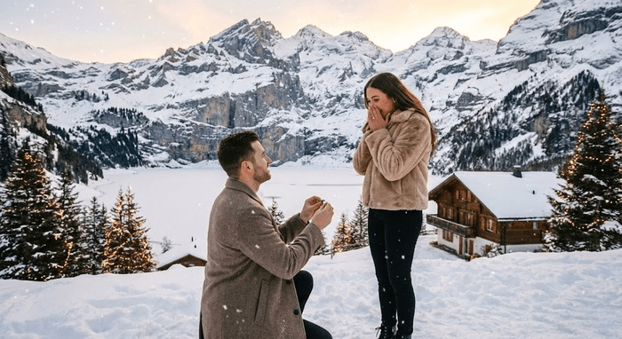 Предложение руки и сердца во Французских Альпах, расположенное на фоне альпийского величия, среди захватывающих спусков по склонам. Представьте, что вы стоите на коленях на снегу, вдыхаете свежий зимний воздух и признаетесь в любви. Или, после волнующего дня катания на лыжах, представьте себе момент уютной романтики в своем частном шале, уютно расположившись у огня, потягивая глинтвейн и наблюдая, как танцуют снежинки на улице.